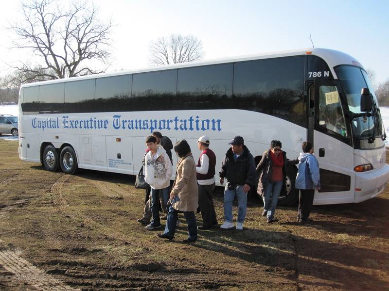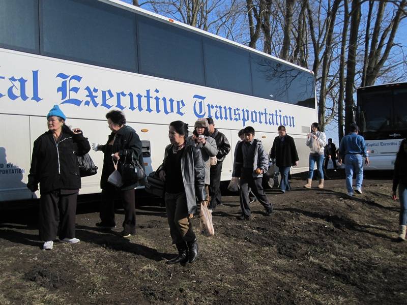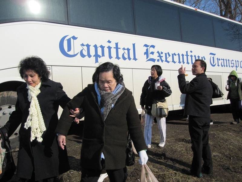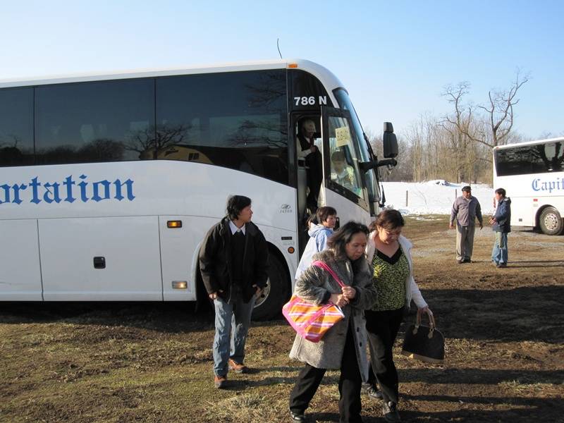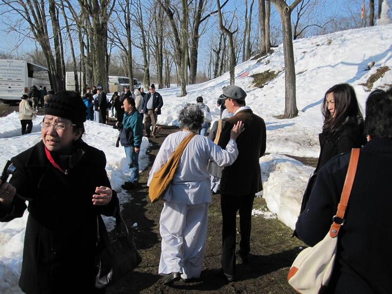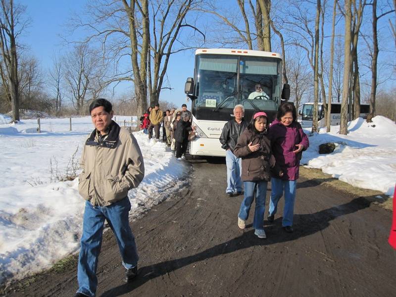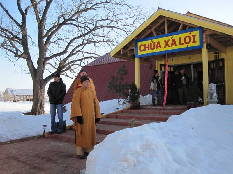 Nhiều xe Bus đưa quý phật tử gần xa tới chùa. Cái lạnh băng giá không thể ngăn chặn mọi người đón xuân. Quý thầy đứng giữa băng tuyết vui cười hoan hỷ mừng đón quý phật tử.