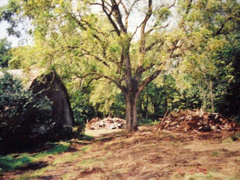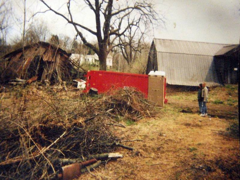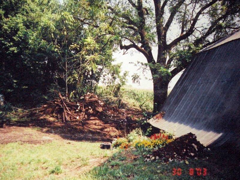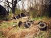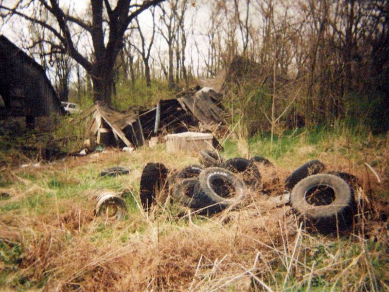 At the outside were a broken barn, old cars, many tires and trash everywhere. The grass was tall and many broken trees.